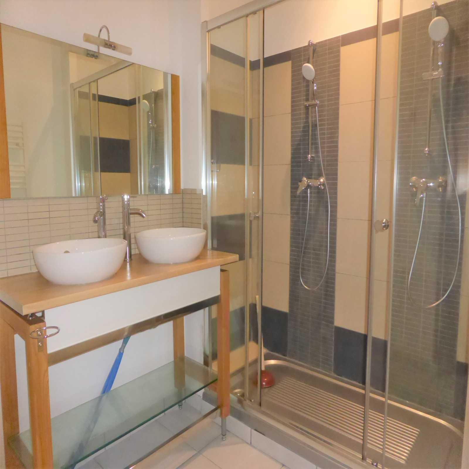 Une pièce de vie ouverte avec cuisine équipée d'une surface totale de 32.5m², une chambre en alcôve de 9.8m² avec grand placard intégré, salle de douches avec meuble double vasque et très grande douche, WC séparé avec emplacement machine à laver.